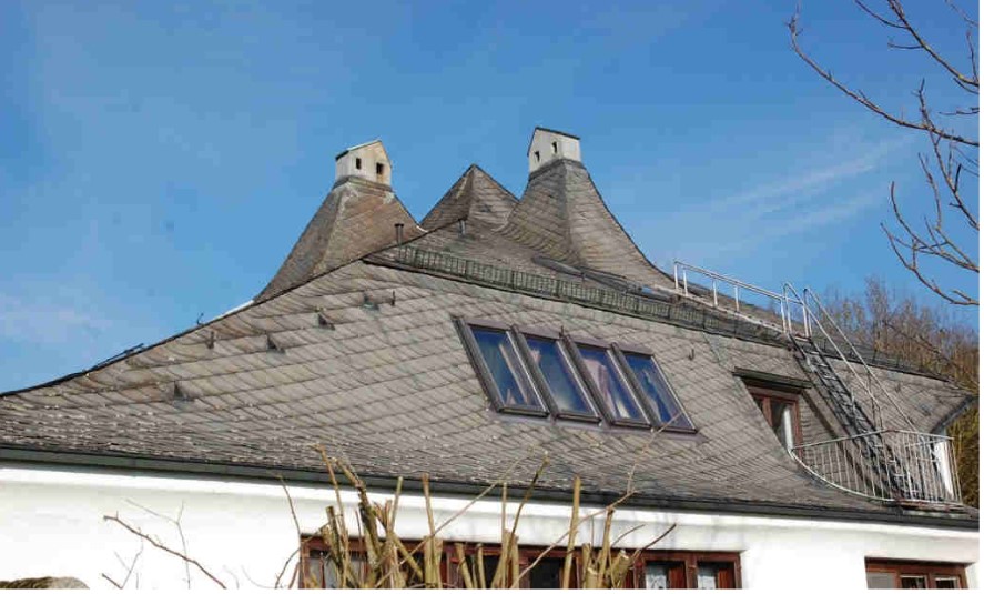 Nach 100 Jahren ist es dringend notwendig geworden, das Dach zu erneuern, um Schäden zu beseitigen und somit den Fortbestand dieses außergewöhnlichen Gebäudes zu sichern. Das Haus ist mit Schieferschindeln gedeckt, und neben diesem besonderen Material macht auch gerade die Formgestaltung des Daches einen guten Teil seiner Einzigartigkeit aus. Nur noch wenige Firmen in Deutschland können solche aufwendigen Dächer bauen bzw. sanieren. Dadurch, wie auch aufgrund der Tatsache, dass es aus Denkmalschutzgründen keine Alternative gibt, ist die Siedlung Bühel vor eine sehr kostenintensive Aufgabe gestellt.