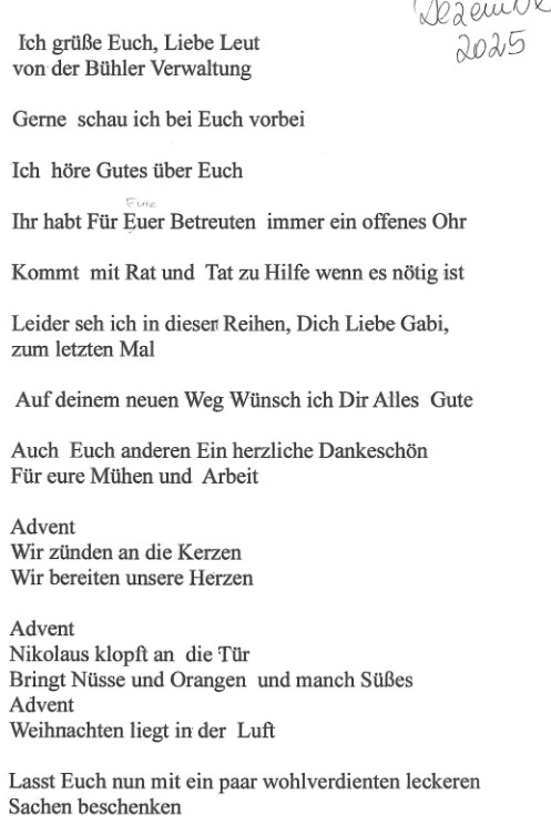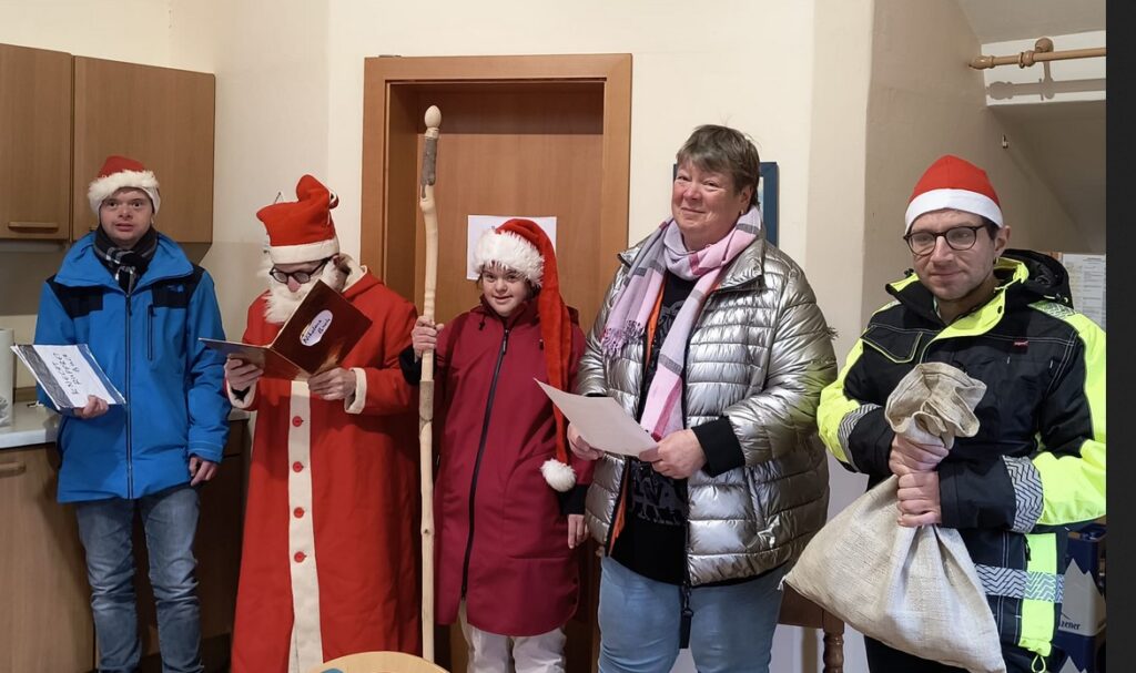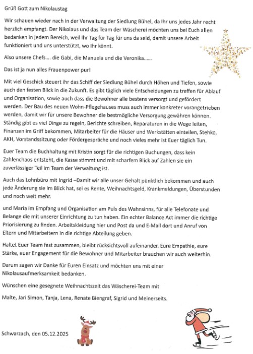 Wie jedes Jahr klopften die Nikoläuse aus unserer Wäscherei im Haus Lukas an, um der Verwaltung die „Leviten zu lesen“. Aber weit gefehlt, es gab nur Lob und Dank, und nicht einmal Knecht Rupprecht fand etwas zu tadeln.